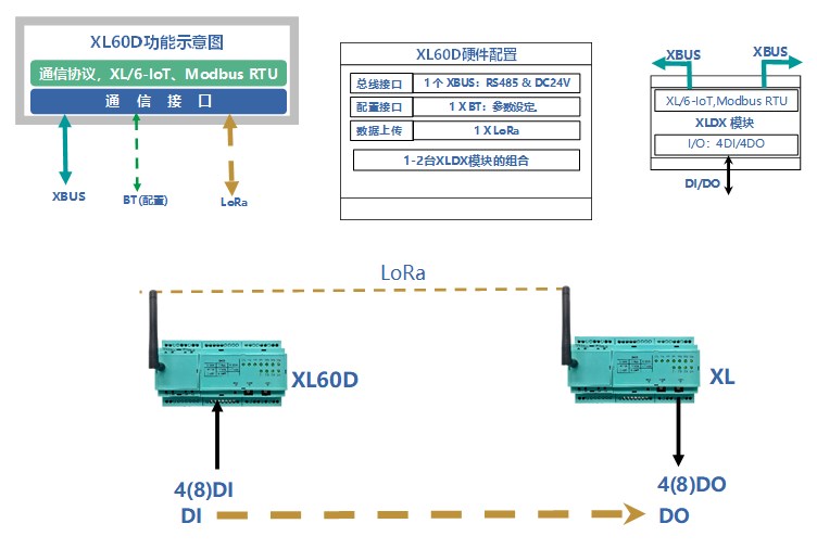 XL60D的通信方式是LoRa无线传输方式,每台XL60D主机模块,最多配两个开关量I/O模块。